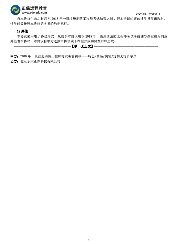 一級(jí)注冊(cè)消防工程師“無憂班”協(xié)議書